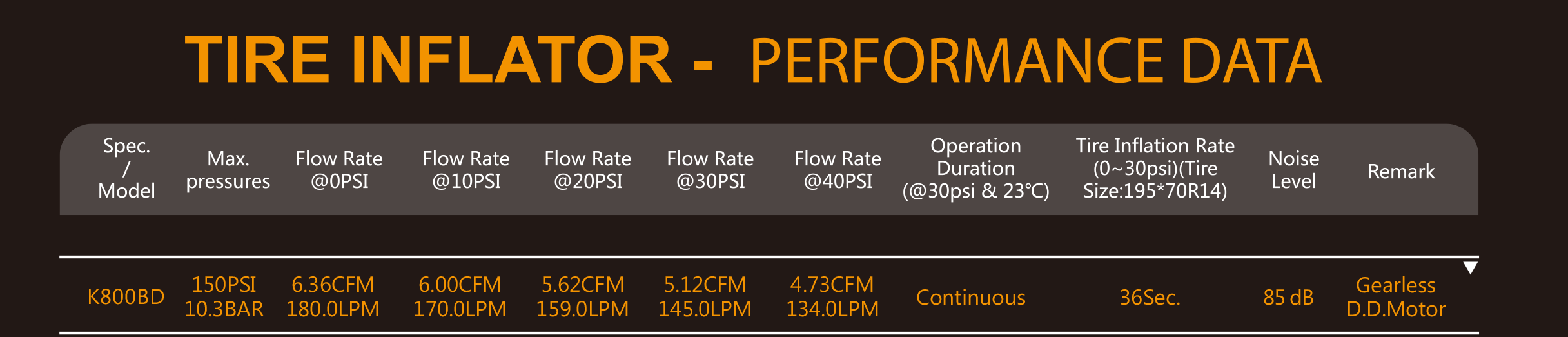 | 35"*12.5"*R15 tire inflation rate | 3Min.33Sec(0~40PSI) |
